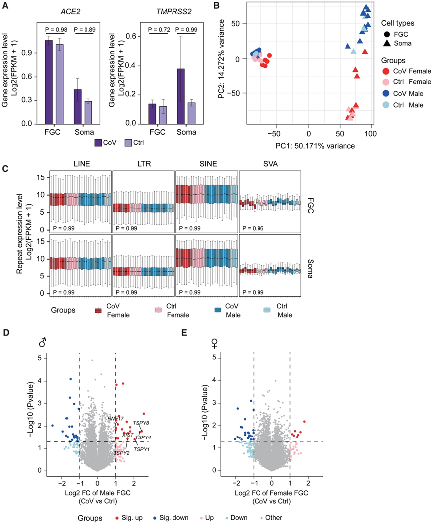 (A) FGC 和性腺体细胞中选定的 SCARF(SARS-CoV-2 和冠状病毒相关受体和因子)的表达水平。(B) CoV 和 Ctrl 组 FGC 和性腺体细胞转录组的主成分分析 (PCA)。(C) FGC 和性腺体细胞中主要人类重复元件类别的表达水平。(D-E) 男性或女性 FGC 中 CoV 组与 Ctrl 组鉴定的差异表达基因 (DEG) 的火山图。