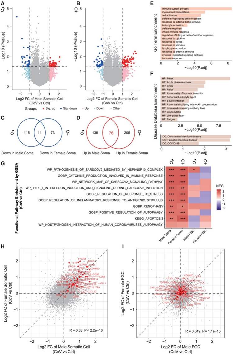 (A-B) 在男性 (A) 或女性 (B) 性腺体细胞中,由 CoV 组与 Ctrl 组鉴定的 DEG 的火山图。 (C-D) 维恩图显示男性和女性性腺体细胞之间下调或上调基因的重叠。(E-F) GO分析和人类疾病本体(DO)数据库分析。(G) 基于分子特征数据库 (MSigDB),对男性和女性性腺体细胞和 FGC 中 CoV 组与 Ctrl 组计算的整个基因表达的 log2 FC 进行基因集富集分析 (GSEA)。(H-I) 散点图显示分别在男性和女性性腺体细胞和 FGC中由 CoV 组与 Ctrl 组计算的所有基因的基因表达变化。