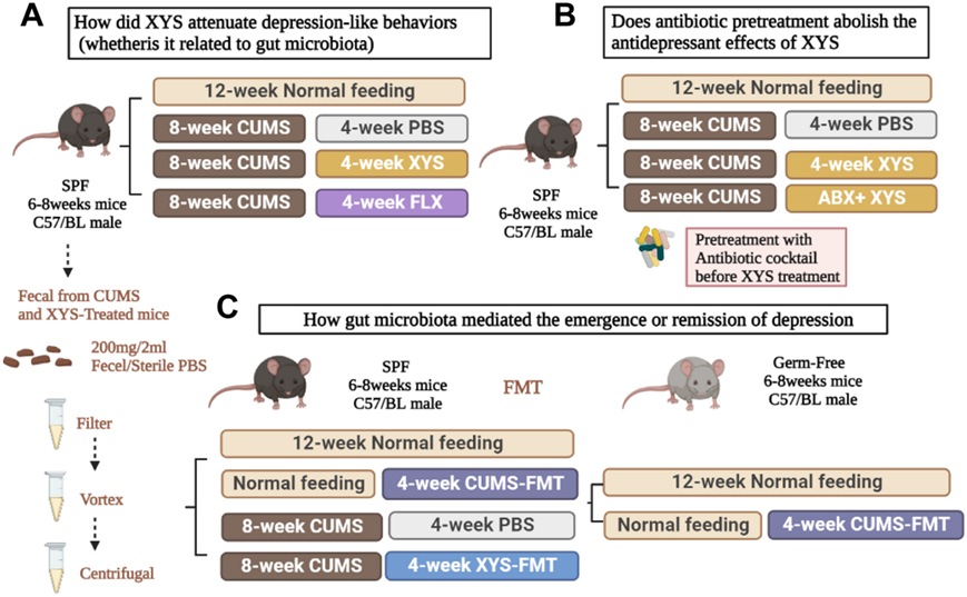 逍遥散(XYS)是一种由多种中药组成的药物,其在亚洲国家(包括中国、日本和韩国)作为情绪障碍的传统治疗方法有着悠久的历史,并且在欧洲国家(包括英国、荷兰)也作为保健食品或草药传统应用。研究团队设计了实验,以评估抑郁症发展过程中肠道微生物群、补体系统和突触修剪的变化,以及 XYS 作为潜在抗抑郁药的药效作用(图 1a)。适应1周后,将小鼠随机分为四组(实验1):对照组、慢性不可预测的轻度应激组 (CUMS)、CUMS+XYS和CUMS+氟西汀(FLX)。除对照组外,其他三组均连续八周承受各种压力源。治疗方法如下:(1)对照组:不给予应激刺激,作为阴性对照。(2)CUMS组:CUMS持续8周,随后每天口服磷酸盐缓冲盐水(PBS),持续4周; (3)CUMS+XYS组:CUMS连续8周,随后每天口服XYS(0.658g/kg/天,连续4周; (4)CUMS+FLX组:CUMS持续8周,随后每天口服FLX。收集海马、下丘脑和前额皮质组织以供将来分析。收集 CUMS 和 CUMS + XYS 组的新鲜粪便(含有或不含代谢物的肠道微生物群)用于后续粪便微生物群移植(FMT)(图 1 A)。评估了抗生素干扰 XYS 抗抑郁作用的能力(图 1 B)。通过使用由氨苄青霉素(1.5 g/mL;A9518;Sigma Aldrich)、万古霉素(500 mg/L;V820413;Macklin)组成的抗生素混合物预先破坏肠道微生物来评估抗生素诱导的微生物群破坏对 XYS 功效的影响。