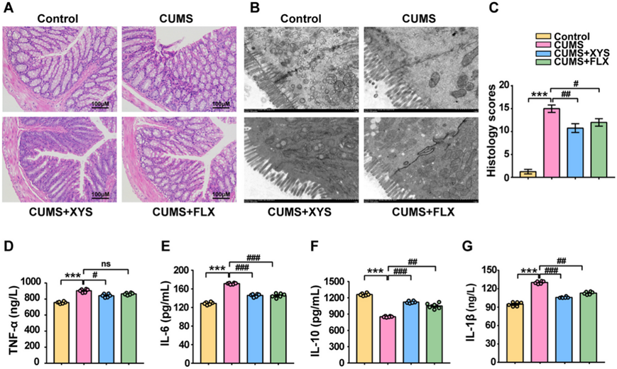 为了了解抑郁症发展过程中结肠病理、屏障功能和全身炎症的变化,他们评估了组织学分析、结肠超微结构形态和血清中炎症细胞因子的水平。与对照小鼠相比,具有抑郁样行为的小鼠表现出明显的结肠炎症,并且病理评分显著升高(图 3A-B)。透射电子显微镜显示,具有抑郁样行为的小鼠的微绒毛大小和数量减少,肠道屏障外观异常(图 3 C)。结肠炎症的加重和屏障功能的破坏会影响外周炎症因子的水平。 CUMS模型中IL-10的表达受到抑制,并且在具有抑郁样行为的CUMS小鼠的血清中观察到IL-1β、IL-6和TNF-α水平升高(图 3D -G)。服用抗抑郁药可以改善结肠屏障功能和炎症病理学。服用XYS后,肠道炎症得到改善,结肠微绒毛的大小和数量增加,异常排列得到逆转(图 3A -C)。此外,XYS还降低了具有抑郁样行为的小鼠血清中IL-1β、IL-6和TNF-α的水平,并增加了IL-10的水平(图 3D-G)。