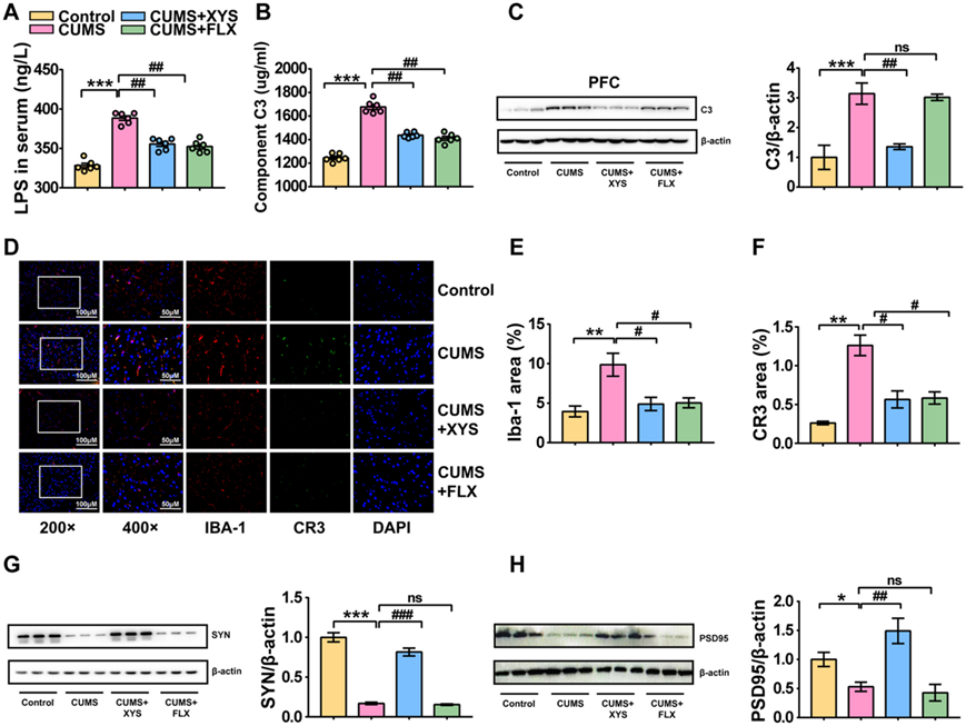 为了验证代谢检测的可靠性,他们评估了血清中的LPS含量。具有抑郁样行为的小鼠血清中LPS浓度较对照小鼠显著升高(图 5A)。然而,XYS 给药降低了脂多糖(LPS) 水平,这与代谢组学分析中观察到的测序结果一致。作为补体系统激活的重要通路,LPS 在具有抑郁样行为的小鼠血清中表现出高表达(图 5 A)。他们探索了外周和中枢补体系统以及突触修剪的可能变化,在血清样本中观察到补体 C3 水平显著升高(图 5 B)。另外,检测了CNS中C3的表达。评估海马、下丘脑和前额皮质中补体 C3 的蛋白表达水平。前额皮质中补体 C3 的表达显著增加(图 5 C)。补体系统参与大脑中小胶质细胞突触修剪的调节。补体 C3 通过引导趋化性小胶质细胞的生长并与小胶质细胞上的补体受体结合,诱导小胶质细胞吞噬标记的突触。