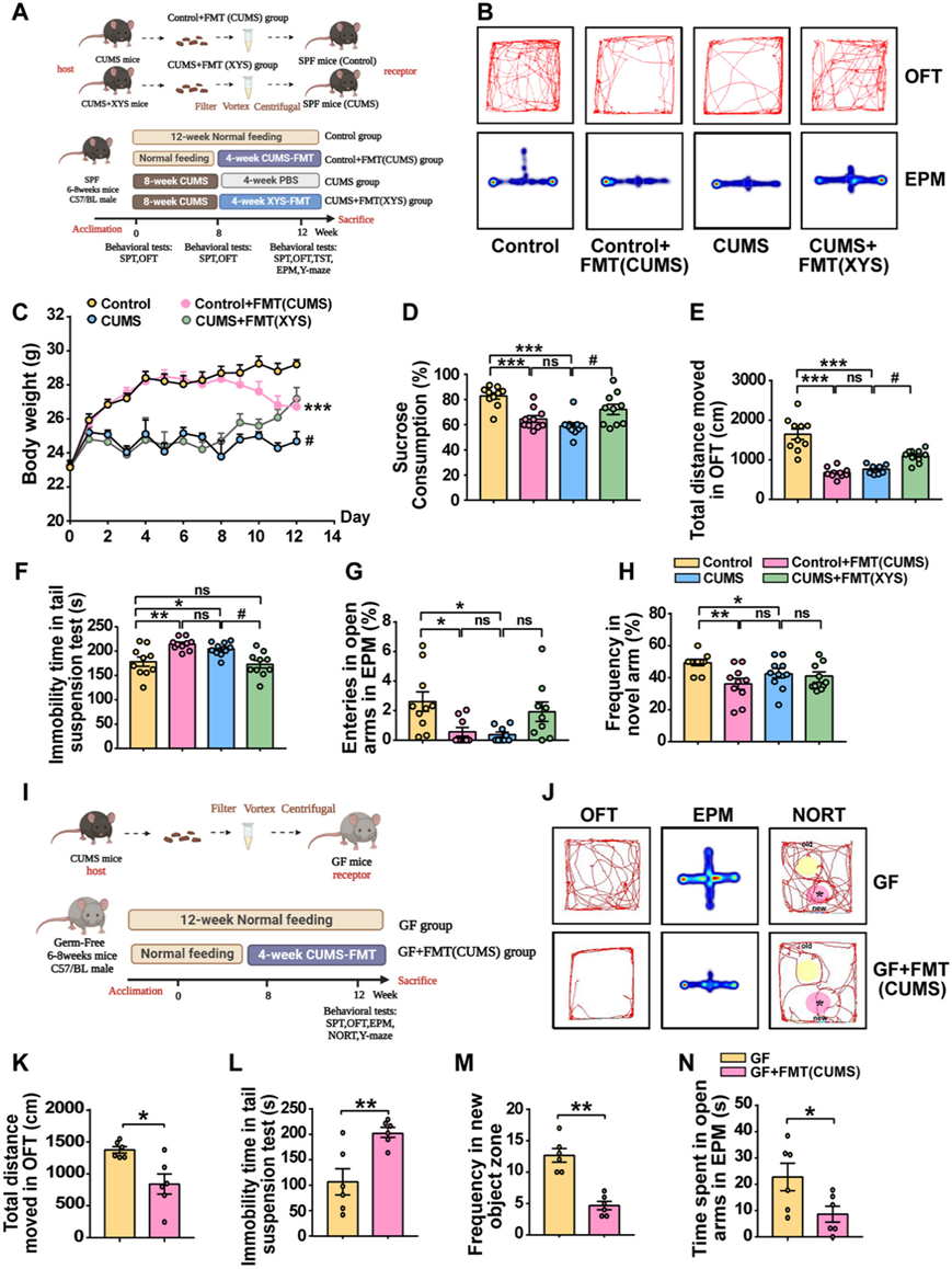 (A) 适应1周后,将小鼠随机分为四组:对照、对照+FMT(CUMS)、CUMS和CUMS+FMT(XYS)。(B) OFT(移动总距离)(SPF 小鼠)。(C)小鼠体重。(D)蔗糖消耗。(E) OFT。(F) TST(SPF 小鼠)。(G) EPM(SPF 小鼠)。(H)Y迷宫测试。(I) GF小鼠的研究设计。(J) 小鼠在OFT, EPM中的运动轨迹。(K) OFT。(L) TST。(M) NORT。(N) EPM。