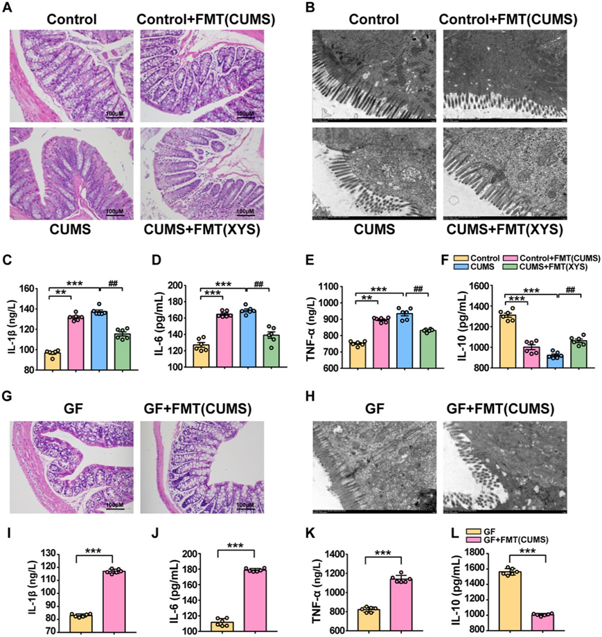 对 CUMS 组小鼠和 XYS + CUMS 组小鼠进行 FMT实验,以研究CUMS-FMT和XYS-FMT对结肠炎症和肠道屏障功能的生物活性。检测HE染色、结肠超微结构形态以及血清IL-1β、IL-6、TNF-α和IL-10水平。与对照小鼠相比,接受 CUMS 诱导小鼠粪便微生物群的 GF 和 SPF 小鼠均表现出明显的结肠炎症综合征(图 7A)。透射电子显微镜显示微绒毛的尺寸和数量减少,并且表现出异常的外观(图 7B)。在接受 CUMS 诱导小鼠粪便微生物群的 SPF 和 GF 小鼠中,还观察到 IL-10 浓度降低,IL-1β、IL-6 和 TNF-α 水平升高(图 7 C-H) 。