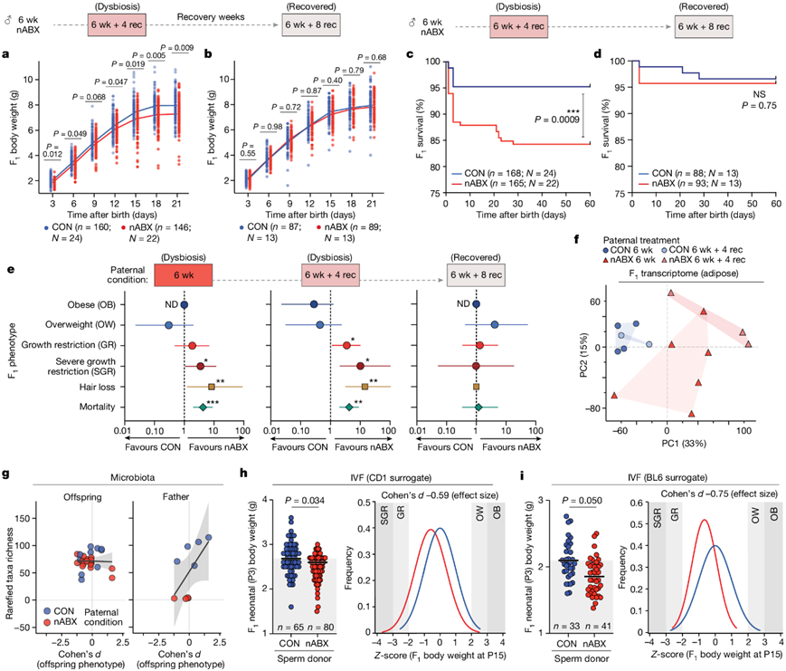 后代表型与其父代的微生物群相关,而不是其自身的微生物群(图2g),一些特定的分类群显示出优先关联。与对照组相比,来自体外受精 (IVF)子代小鼠出生体重显著降低,SGR发生率升高(图2h)。使用BL6受体母鼠(相对较差)进行独立IVF, 来自nABX组小鼠精子产生的F1出生体重差异更大(图2i)。