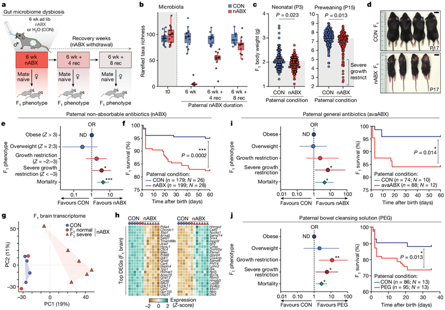 (a)实验设计。(b) 通过 16S rRNA 测序对雄性 nABX 处理6 周后和恢复 (rec) 时间过程中微生物分类群丰富度进行定量。(c) 根据父本nABX处理,F 1后代在出生后P3和P15天的体重。(d) 来自失调父系的F 1后代中SGR表型的代表性图像(nABX处理)。(e) 森林图显示存活到 P15 的后代体重异常风险的对数 OR。(f) Kaplan-Meier 图显示 F1后代的出生后存活率取决于父本 nABX 处理方案。(g) 来自对照或nABX组的F 1大脑的转录组的PCA。(h) 热图显示 F 1 SGR 大脑中最上调和下调基因的表达。(i) 左图:F 1对异常体重和死亡率的易感性。右图:生存分析。(j) 左图:F1的 OR。右图:生存分析。
