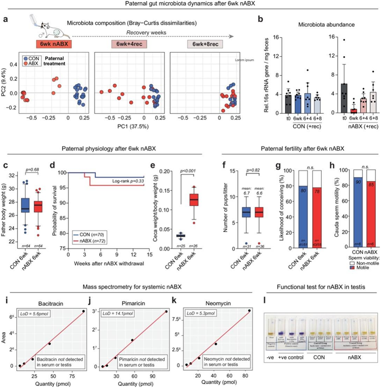 (a) 主成分分析 (PCA)。(b) qPCR 定量 nABX 6 周后以及 4 周和 8 周恢复 (+rec) 后的微生物总丰度。(c) 体重分析。(d) 生存曲线分析。(e) 盲肠与体重的比率。(f) 来自 nABX 处理的雄性小鼠的每窝幼崽数量。(g) 6 周 nABX 后雄性繁殖后代的可能性。(h)精子活力分析。 (i-k)雄性小鼠组织中 nABX 混合物的每种成分进行质谱分析。(l) nABX处理的小鼠功能分析。