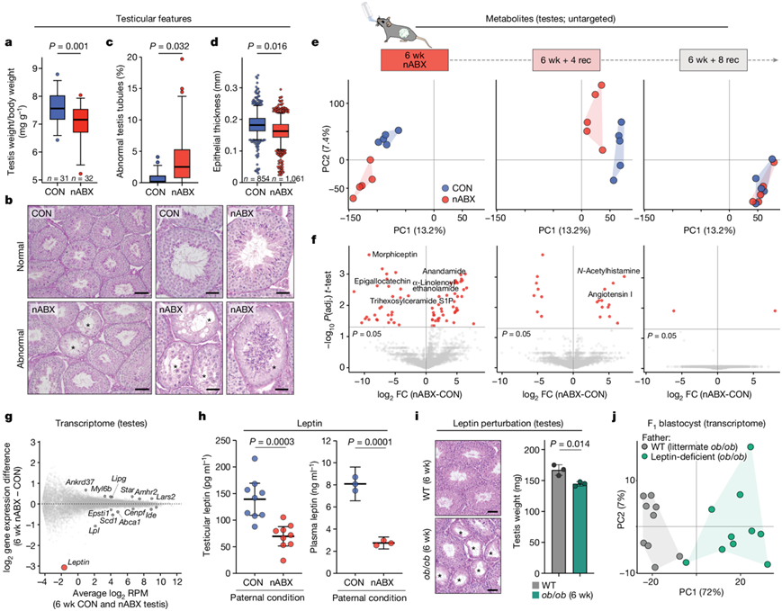 (a) 箱线图显示雄性接受 nABX 处理 6 周后睾丸质量与体重的比率。(b) 来自对照和nABX雄性的睾丸的代表性苏木精和伊红染色的组织学切片。(c) 对照和失调雄性中异常睾丸小管的定量。(d) 生精小管上皮厚度的定量。(e)非靶向代谢组学谱的PCA。 (f) 差异富集的代谢物。 (g) 基因表达变化分析。(h) 睾丸(左)和循环血浆中瘦素激素水平的定量(右)。(i) 睾丸特征分析。(j) 转录组PCA。
