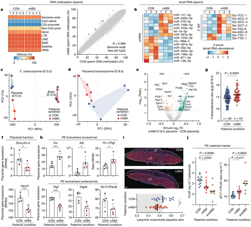 (a) DNA 甲基化水平分析。(b) miRNA(左)和 tRNA 片段(右)的丰度差异。(c) 根据父系暴露的胚胎(E13.5)脑和胎盘转录组的PCA。(d) 来自独立窝的E18.5胎盘转录组的PCA。(e) 火山图显示经 6 周 nABX 处理的雄性所生育的 E18.5 胎盘中的 DEG。(f) E18.5胎盘中胎盘发育关键基因的表达。(g) E18.5时胎儿质量与胎盘质量的比率,取决于孕前父系的状况。(h) 来自nABX父系的E18.5胎盘中先兆子痫(PE)的生物标志物的表达。(i) 上图:对 DAPI(蓝色)和 VE-钙粘蛋白(红色)进行染色以划分迷路区 (LZ)。下图:将 LZ 显示为总面积的比率。 (j) F1胎盘中胎盘生长因子 (PLGF) 蛋白的水平(左)、PE 标志物和 sFLT1/PLGF 比率(右)。