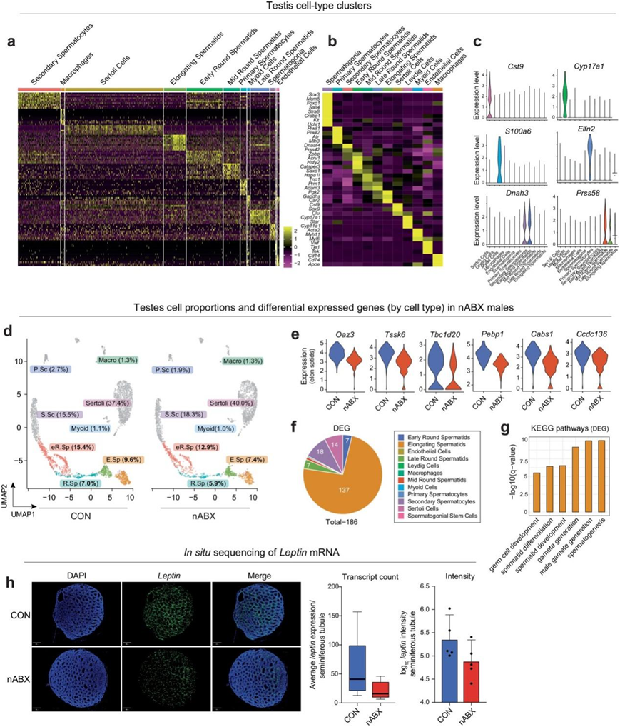 (a-b) 细胞特征聚类的标记基因表达。 (c) 小提琴图显示小鼠睾丸中特定细胞类型聚类内选定标记基因的表达谱。(d) UMAP可视化。(e) 小提琴图显示了伸长精子细胞中 DEG 单细胞表达谱的代表性实例。(f) nABX 暴露的雄性中每种睾丸细胞类型内的DEG。(g) 伸长精子细胞差异表达基因的 KEGG 通路分析。 (h) 单细胞原位测序证实暴露于 nABX 的雄性生精小管中瘦素表达减少。