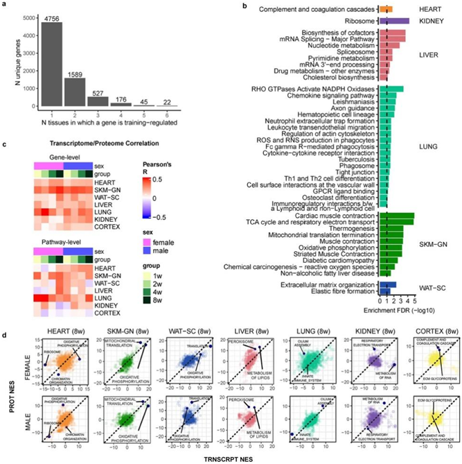 大多数具有至少一种训练响应特征的基因是组织特异性的(67%),其中数量最多的基因出现在白色脂肪组织中(图2a)。他们确定了这些组织特异性训练响应基因富集的通路。他们还观察到多组学(ome)特异性反应,在基因和通路水平上具有独特的转录本和蛋白质反应(图S4c-d)。