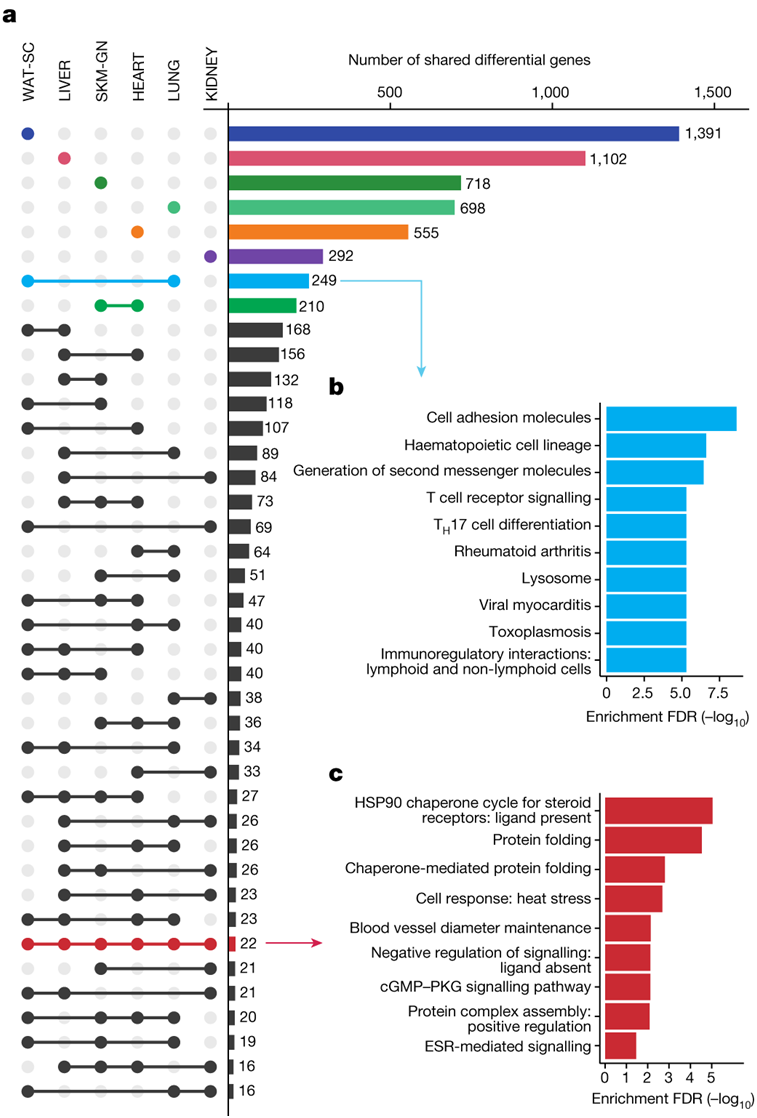 2359 个基因在至少两个组织中具有差异特征(图2a)。肺和白色脂肪组织具有最大的一组独特共有基因,主要富集免疫相关通路(图2b);表达模式表明肺部炎症减少,白色脂肪组织中免疫细胞募集增加。心脏和腓肠肌拥有第二大的独特共有基因,线粒体代谢通路富集,包括线粒体融合基因Opa1和Mfn1。