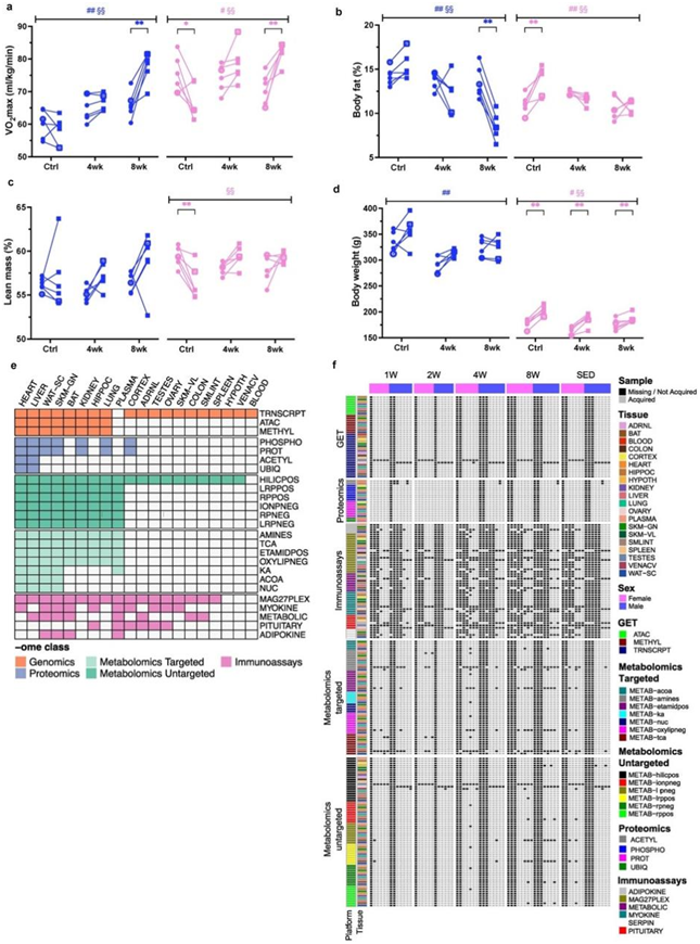 (a-d) 未经训练的对照大鼠 (SED)、训练 4 周(4w)的大鼠和训练 8 周(8w)的大鼠的训练干预前后的临床测量。(e)可用数据集的描述。(f) 跨检测的样本数据的详细可用性。