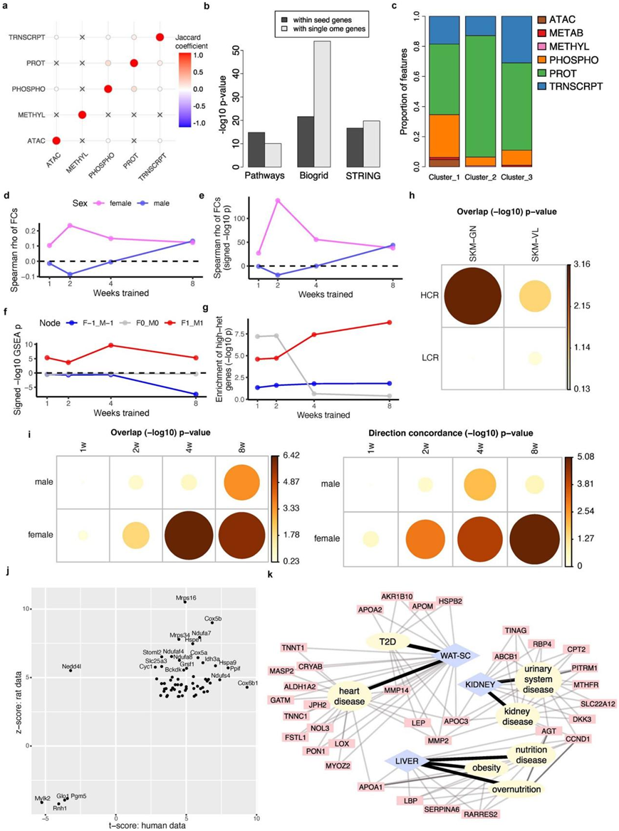(a) 8周腓肠肌上调特征中不同基因组识别的基因集之间的杰卡德系数。(b) 腓肠肌第 8 周多组学基因和单组学基因之间的网络连接 p 值。(c) 通过网络聚类分析确定的腓肠肌反应聚类中代表的每个基因组的特征比例。(d-g) 大鼠股外侧肌差异表达结果与人类长期运动研究的Meta分析结果重叠。(h) 比较本研究第 8 周的大鼠雌性腓肠肌和股外侧肌差异转录本以及大鼠雌性比目鱼肌数据的差异基因。 (i) 本研究中大鼠腓肠肌差异蛋白与人类耐力训练蛋白质组学结果的比较。(j) 重叠蛋白质统计。(k) 白色脂肪、肾脏和肝脏基因组的疾病通路富集结果。