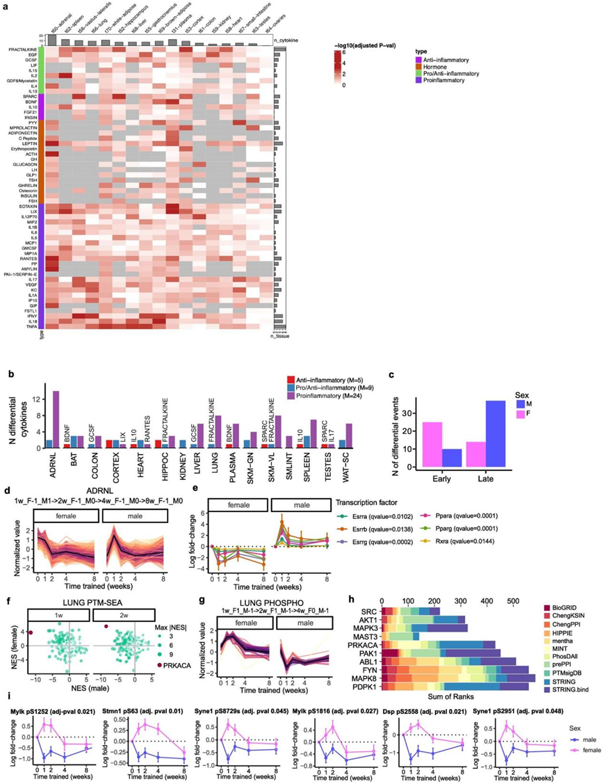 (a) 跨组织免疫分析物训练响应的热图。(b) 跨组织训练差异细胞因子。(c) 根据图形分析指定的状态,包括所有组织,对早期、(1 或 2 周)与晚期(4 或 8 周)差异细胞因子进行计数。(d) 差异特征丰度的线图。(e) 对应于六个转录因子(TF)的转录本水平分析。(f) 来自肺部翻译后修饰 (PTM) -SEA 的雄性与雌性的标准化富集分数 (NES)。(g) 训练差异磷酸位点标准化丰度的线图。(h) 训练差异磷酸位点的底物(蛋白质)过度表达最多的前十种激酶。(i) 线图显示 PRKACA 磷酸盐底物的磷酸盐水平。