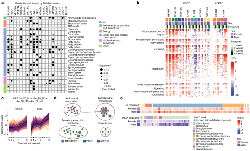他们总结了使用 RefMet 代谢物类别的代谢组数据集(图6a)。肝脏中显著富集的代谢物种类最多,其次是心脏、肺和海马体。单个代谢物和酰基肉碱组揭示了与训练反应的功能改变相关的变化。特别有趣的是,三甲胺-N-氧化物与心血管疾病有关。他们观察到1-甲基组氨酸(肌肉蛋白转换的标志)在1、2和4周时在肾脏中上调,这可能表明在早期训练时间点肌肉分解和通过肾脏清除。皮质醇水平增加,正如预期的训练生理压力,他们观察到肾脏的显著增加,再次可能是由于肾脏清除所致。第 8 周时,肝脏显示 1-甲基烟酰胺上调,这可能在炎症中发挥作用。氧化磷酸化在大多数组织中富集,并且与肌肉组织的联合分析一致(图4c),表明线粒体生物发生的潜在变化。他们使用线粒体RNA测序(RNA-seq)分析耐力训练中线粒体基因的变化比例,并通过GSEA使用基因表达、蛋白质丰度和蛋白质PTM来估计线粒体功能的变化(图6b)。观察到骨骼肌、心脏和肝脏中的线粒体生物发生增加。此外,如前文所述,他们在肾上腺以及结肠、肺和肾中观察到性别特异性线粒体变化。这些结果突出了耐力训练中高度适应性和无处不在的线粒体反应。在肝脏中,他们观察到蛋白质组、乙酰组和脂质组代谢通路的实质性调节(图6a-b)。例如,属于“脂质和脂质相关化合物”的12个代谢物类别显著富集(图6a)。随着时间的推移,两性都增加了大量特征(图6c)。这些肝脏特征大多与线粒体、氨基酸和脂质代谢通路中的蛋白质丰度和蛋白质乙酰化变化相关(图6d)。他们还观察到磷脂酰胆碱的增加和甘油三酯的减少(图6e)。