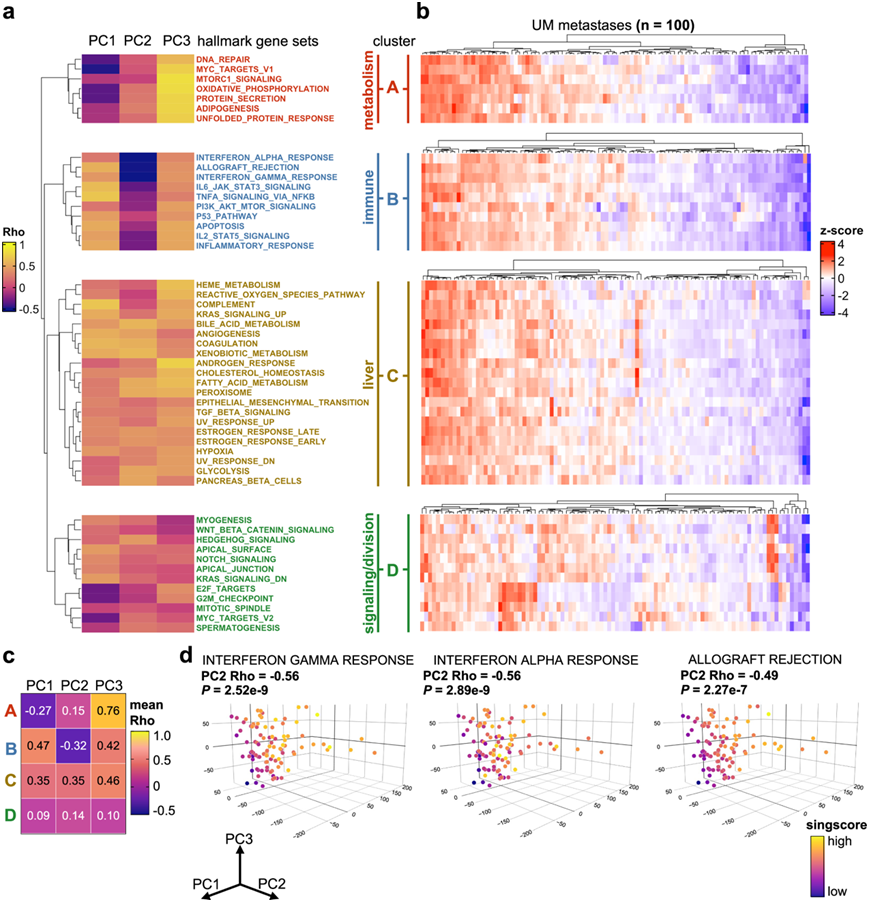 (a) Spearman 等级相关系数的无监督聚类。(b) 热图显示了 UM 转移瘤标志特征富集的异质性。(c) 每个聚类-PC 组合的平均 Spearman 等级相关系数矩阵。(d) 三维 PCA 图显示聚类 B 中确定的选择性标志免疫相关途径的富集分数。