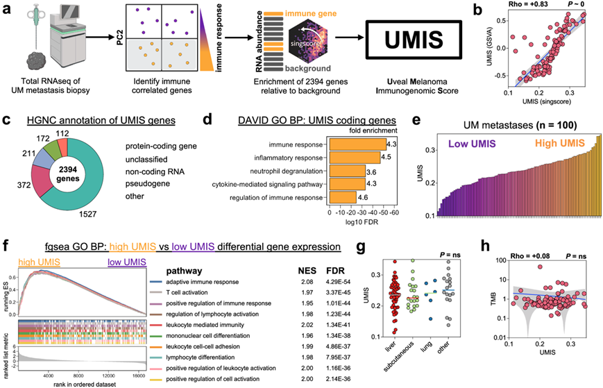 接下来,他们试图将基本的PC2变量细化为更具体和临床适用的UM转移免疫指标。首先,确定了2394个与免疫和炎症标志基因集富集正相关的基因。此外,为了实现单样本前瞻性分析,他们采用了一种基于队列的基于序列的基因集评分方法,根据转录本丰度计算个体活检的富集分数(每百万的转录本:TPM)。使用这种方法,他们为每个转移生成了一个单一的连续变量,称为葡萄膜黑色素瘤免疫基因组评分(UMIS),它反映了样本转录组中2394个基因列表的一致性和排序(图3a)。队列独立的UMIS与使用已建立的方法(GSVA)计算的相应队列依赖评分密切相关,证明本项研究方案可用于肿瘤活检的前瞻性评估(图3b)。在构成UMIS的2394个基因中,1527个是蛋白质编码基因,其余867个是非编码、未分类和伪基因的混合物(图3c)。UMIS编码基因的功能注释证实了与免疫和炎症反应相关的途径(图3d)。在100个转移瘤中,UMIS值为0.114 - 0.347,中位评分为0.237,这是定义UMIS高和低组进行分类比较的截止值(图3e)。高和低UMIS转移的基因集富集分析表明,最显著富集的途径存在于高UMIS组,并涉及T细胞活化(图3f)。UMIS水平与转移部位、TMB、体细胞突变和拷贝数改变以及I类人白细胞抗原(HLA)等位基因无关(图3g-h)。因此,UMIS代表了一种独特的单样本基因表达评分,该评分来自编码、非编码和未注释转录本的无偏混合,可以根据免疫和炎症基因的表达水平对UM转移进行排序。