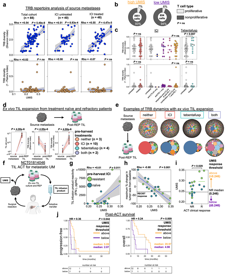 (a) 对 UM 转移瘤的bulk RNA-seq进行 T 细胞受体 β (TRB) 谱分析。(b) 按单细胞图谱计算的 UMIS 组中增殖性 T 细胞的比例。(c) 未治疗的 ICI 或 tebentafusp 与已治疗的转移瘤中 TRB 多样性和克隆性的比较。(d) 来自未接受治疗和难治性患者的体外 TIL 扩增。(e) 离体 TIL 扩增的 TRB 动力学示例。(f) 在 NCT01814046(转移性 UM 的 TIL ACT)背景下评估 UMIS 的示意图。(g) 源转移 UMIS 与 TIL 输注产品反应性的相关性。 (h) TIL ACT 后源转移 UMIS 与肿瘤大小相对于基线 (RECIST v1.1) 的最大百分比变化的相关性。 (i) TIL ACT应答者和无应答者之间 UMIS 的比较。 (j) 按 UMIS 反应阈值计算的 ACT 后生存时间-事件曲线。