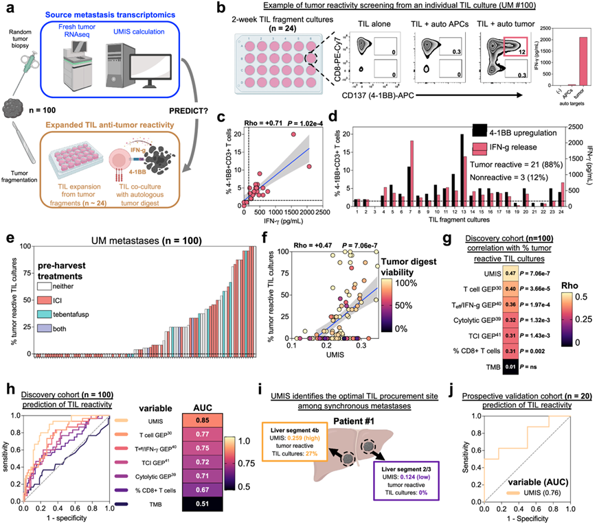 (a) 用于并行分析源肿瘤转录组和扩展 TIL 抗肿瘤反应性的工作流程。(b) 从源肿瘤 UM #100 中筛选 TIL 培养物抗肿瘤反应性的示例。(c) 过夜肿瘤共培养后,来自 UM #100 的 24 个片段培养物中 %4-1BB + CD3+ 细胞与 IFN-γ 释放之间的相关性。(d) 通过源肿瘤 UM #100 的 4-1BB 上调和 IFN-γ 释放评估单个 TIL 片段培养物抗肿瘤反应性。(e) 100 个转移瘤队列中肿瘤反应性 TIL 培养物百分比的分布。(f) UMIS 与肿瘤反应性 TIL 培养物百分比的相关性。(g) UMIS 与已发表的基因表达谱和肿瘤生物标志物的相关基准测试。(h) UMIS 针对已发表的基因表达谱和肿瘤生物标志物的预测基准。(i) UM 患者 #1 中同步肝转移的 UMIS 和 TIL 培养反应性不同。(j) 在独立的转移性活检队列中验证 UMIS 预测离体 TIL 反应性的能力。
