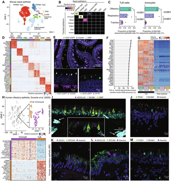 (A) 13052 个细胞的t分布随机邻域嵌入 (tSNE) 嵌入,通过无监督聚类进行着色和标记。 (B) 热图显示使用随机森林分类为每种气管细胞类型(行)的每种鼻上皮细胞类型(列)。(C)来自幼稚鼻黏膜中的EpCAM+细胞的每只小鼠(点)的所有上皮细胞(点)中的簇状细胞(上)和离子细胞(下)的分数(x轴)。(D)数据集中特定于每种细胞类型的前 50 个基因(行)的相对表达。(E)免疫荧光染色。(F) 随机森林分类。(G) 三种组织中簇状细胞和其他上皮细胞中簇状细胞标记基因的相对表达。(H) 3528 个嗅觉上皮细胞、免疫细胞和神经元细胞的 tSNE 嵌入(上),显示了对包含簇状细胞和离子细胞的 116 个 MVC 聚类的新重新分析以及差异表达基因的热图(下)。(I-M) 免疫荧光分析。