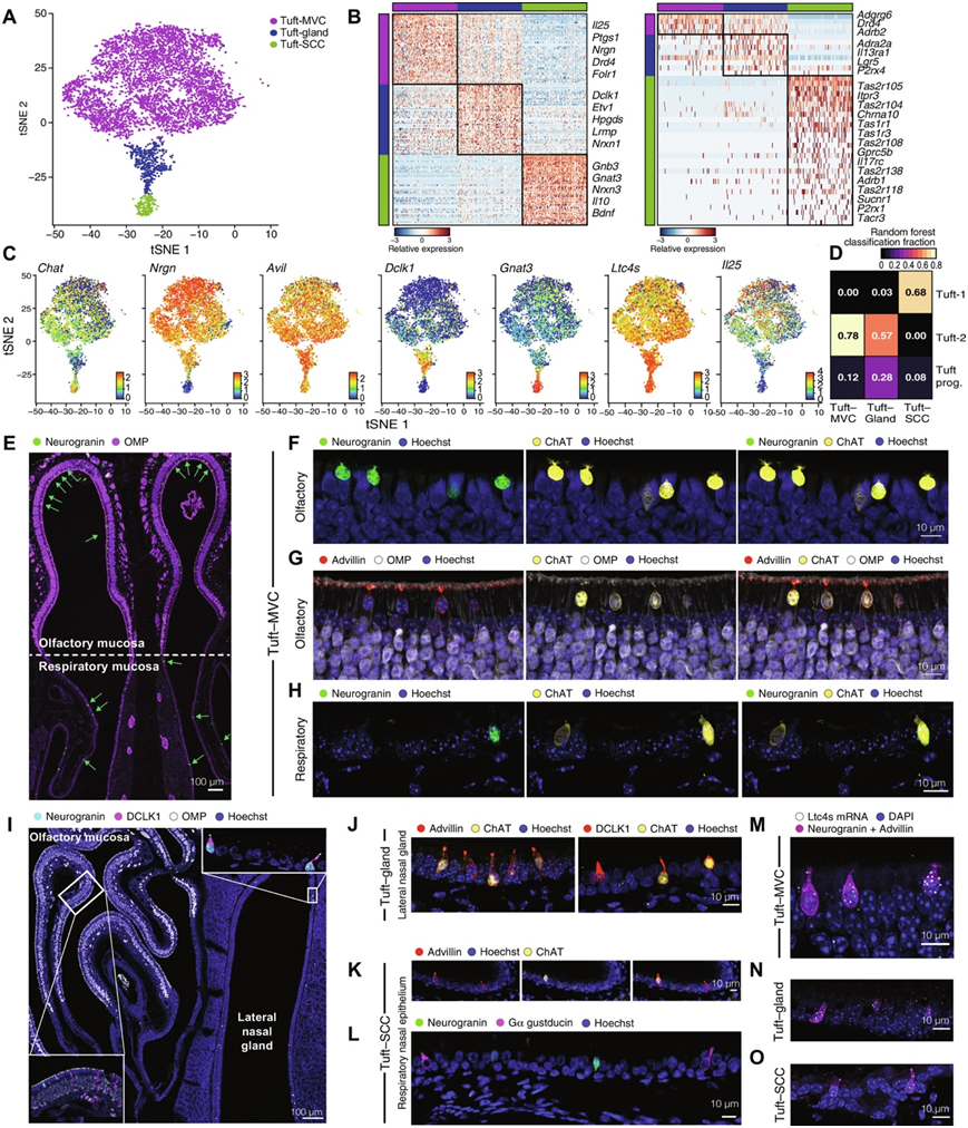 (A) 源自 ChAT-eGFP 小鼠的 5594 个簇状细胞的 tSNE 嵌入,通过无监督聚类着色。 (B) 热图显示每个特异性表达的标记物(左)和 G 蛋白偶联受体基因(右)的表达水平。(C) tSNE 图显示共有簇状细胞标记和亚型标记的表达。(D) 热图显示使用随机森林分类为每个气管细胞亚型(行)的每个鼻簇状细胞亚型(列)。(E-L) 簇状细胞亚群的免疫定位。(M-O) 用 RNAscope 探针对Ltc4s进行原位杂交。