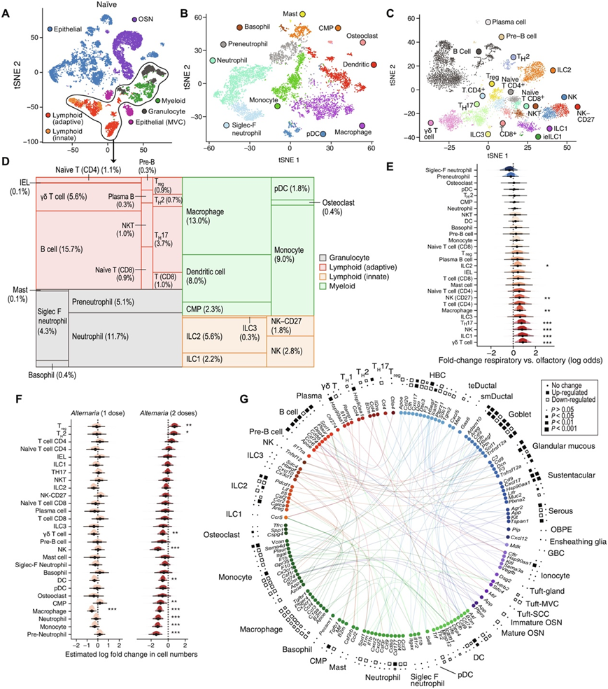 (A) 通过 scRNAseq 评估来自幼稚小鼠鼻黏膜的 19275 个细胞的 tSNE 嵌入;显示了通过无监督聚类识别的细胞类型谱系。 (B-C) 7107 个骨髓和 7213 个淋巴细胞的 tSNE 嵌入(点)。(D) 树状图显示了幼鼠免疫区室的细胞类型组成。(E-F) 组织位置和吸入一剂和两剂Alternaria 对每种免疫细胞类型比例的影响。(G)圆形图显示Alternaria吸入后细胞类型之间差异表达的受体配体相互作用。
