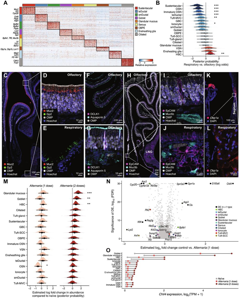 (A) 热图显示每个非感觉上皮子集特异性表达的前 30 个标记基因(行)的表达水平。(B)组织位置对每种上皮细胞类型比例的估计影响。(C-L)嗅觉和呼吸道鼻黏膜中上皮细胞亚群的免疫定位。(M)吸入一剂(左)和两剂(右)Alternaria对上皮细胞亚群比例的估计影响。(N) 火山图显示了吸入一剂Alternaria后上皮亚群(颜色图例)内基因(点)的差异表达和显著性之间的关系。(O)吸入Alternaria前后几丁质酶样蛋白 4 (Chil4) 的表达水平。