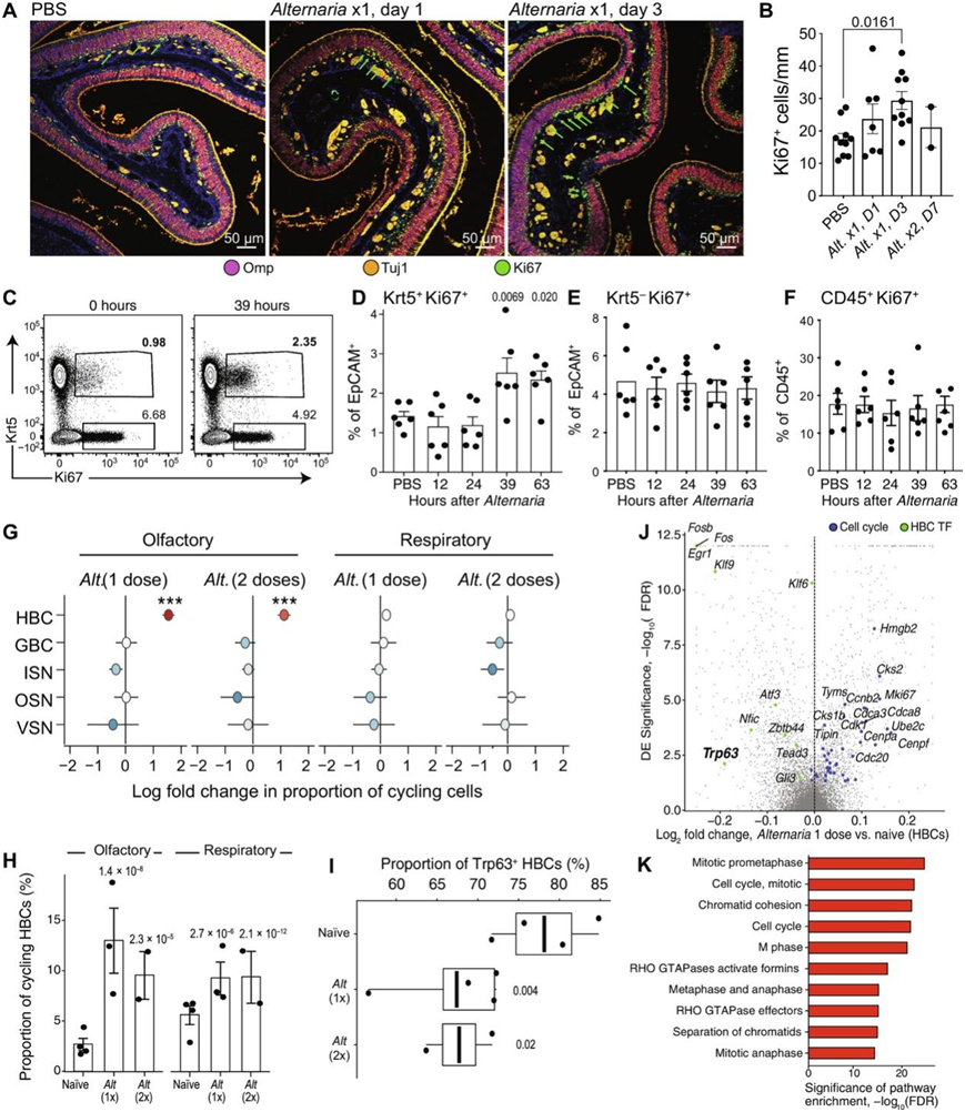 在组织学上,最显著的变化发生在嗅神经上皮基底层,吸入Alternaria后Ki67+细胞数量明显增加(图5A-B)。吸入Alternaria后,角蛋白5 (Krt5) +潜伏状态的嗅觉水平基底水平干细胞(HBC)增殖,而增殖的免疫或非免疫细胞(包括Ki67+Kit+球状基底细胞)的数量没有显著变化(图5C-F)。最后,他们还发现,参与细胞增殖的基因表达程序在嗅上皮内的HBC中发生强烈和特异性地诱导。Krt5+增殖细胞在嗅觉上皮中的比例增加了6.1倍,而在呼吸上皮中仅增加了1.8倍(图5G-H)。转录因子p63 (Trp63)通过抑制HBC分化促进嗅觉干细胞自我更新,其缺失先于HBC增殖。与空气过敏原诱导的HBC激活一致,他们发现Alternaria感染后HBC中的Trp63表达显著降低(图5I)。差异表达(DE)分析显示,许多细胞周期基因由HBC上调(图5J),通路分析证实,增殖程序最显著富集(图5K)。综上所述,这些数据表明,吸入Alternaria可在36至72小时内诱导正常静止的HBC增殖,但不会导致osn或支撑细胞凋亡。
