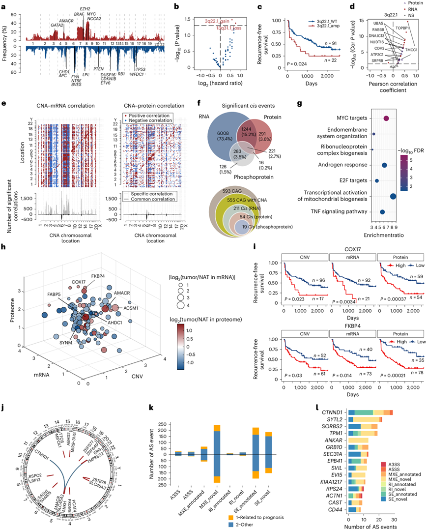 (a) 125 个肿瘤样本中基因水平拷贝数扩增(红色)和缺失(蓝色)的频率。(b) 所有具有生存信息的患者中局灶性 CNV 事件的 Cox 比例风险回归分析。(c)生存分析。(d) 3q22.1 中编码基因在蛋白质或 mRNA 水平上的显著顺式效应。(e) CNA对mRNA 和蛋白质的顺式和反式效应。(f) 维恩图总结了转录组、蛋白质组和磷酸化蛋白质组水平上所有 CNA 的显著顺式效应。(g) KEGG 通路富集了 221 个在转录组、蛋白质组和磷酸化蛋白质组水平上表现出顺式效应的基因。(h) 三维散点图说明了基因与多组学水平上无复发生存期的关联。(i) 按 COX17 和 FKBP4 的高或低拷贝数、mRNA 和蛋白质水平分层的患者无复发生存期的 Kaplan-Meier 生存曲线。(j) 圆形图显示基于 RNA-seq数据在两名或两名以上患者中发现的融合事件。 (k) 肿瘤和 NAT 中改变的 AS 基因数量与良好/较差无复发生存期相关或不相关。(l) AS 事件出现频率高。