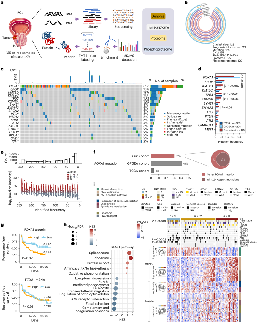 (a)实验设计。(b) 患者信息以及用于基因组学、转录组蛋白质组学和磷酸化蛋白质组学分析的配对样本数量。(c) 基因组突变谱。(d) TCGA 队列、CPGEA 队列和本研究队列中 PCa 相关基因突变频率比较。(e) 所有 120 个肿瘤样本中具有不同识别频率的每个磷酸化位点的中位强度分布。(f) TCGA、CPGEA 和本研究队列中FOXA1突变频率比较。(g) 生存分析。(h) 通路富集分析。(i) 热图总结了按 GS 分类的患者中上调或下调的代表性 mRNA 和蛋白质。
