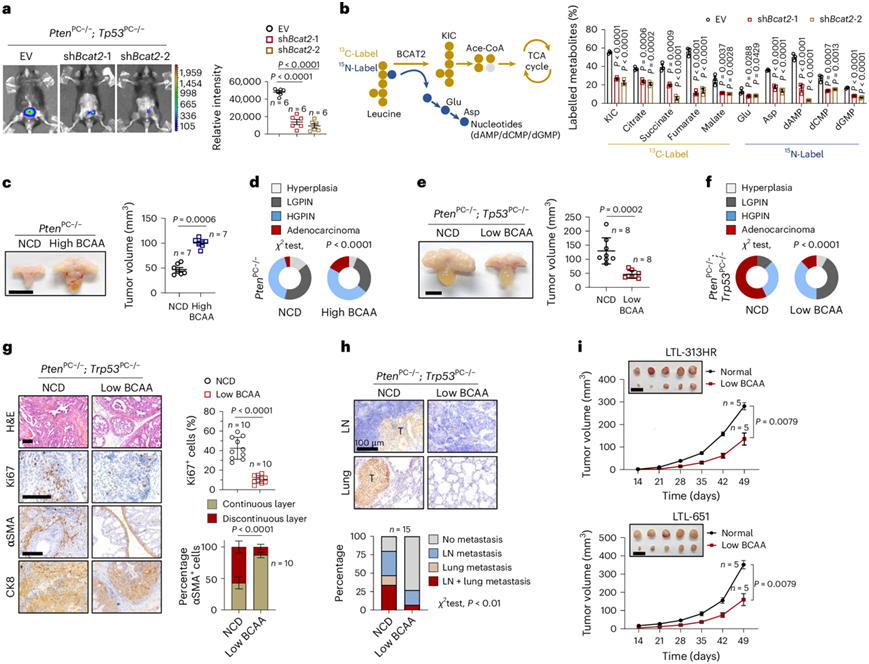 他们进一步探究低 BCAA 饮食是否能抑制侵袭性 PCa 的进展。为此,转移性Pten PC−/− ; Trp53 PC−/−小鼠在 1.5 月龄时以低 BCAA 饮食喂养,并在 2 个月后进行评估。喂食低 BCAA 饮食的Pten PC−/− ; Trp53 PC−/−小鼠的前列腺体积显著较小(图6e)。在用低 BCAA 饮食处理的Pten PC−/− ; Trp53 PC−/−小鼠中,以 α-SMA 染色和 Ki67+细胞为特征的局部侵袭性癌症区域同时减少(图6f-g)。值得注意的是,低 BCAA 饮食显著阻碍了 AR 阳性肿瘤结节向腰淋巴结和肺部的转移性扩散(图6h)。他们还采用了患者来源的异种移植 (PDX) 模型 LTL-313HR 和 LTL-651 来评估这种饮食干预方法,结果证明低 BCAA 饮食干预可有效限制 PDX 生长(图6i)。