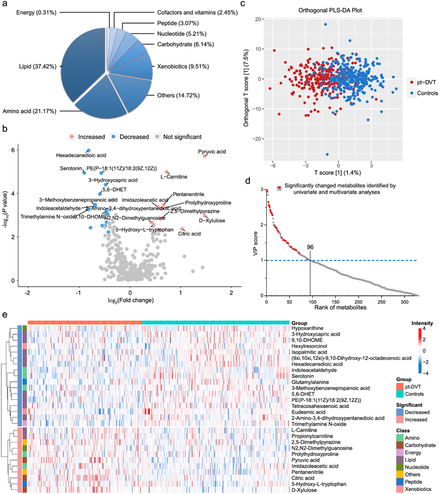(a) 代谢物在基于通路的类别中的分布。(b) 差异代谢物的火山图。(c) 正交偏最小二乘判别分析 (OPLS-DA) 得分图。(d) OPLS -DA 模型的投影 (VIP) 得分中的变量重要性。(e) 个体中 28 种差异代谢物的热图。