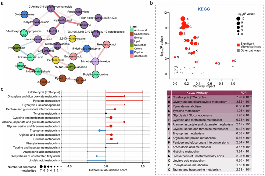(a) 28 种显著改变的代谢物的去偏稀疏偏相关分析 (DSPC) 网络。(b) pt-DVT 患者中发生显著变化的代谢通路。(c) 基于通路的 pt-DVT 代谢变化分析。