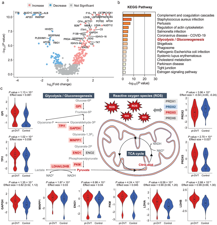 (a) 差异蛋白的火山图。(b) 差异蛋白的 KEGG 通路富集确定了 15 条与 pt-DVT相关的重要通路。(c) 代谢通路(糖酵解/糖异生和 TCA 循环)与选定代谢物和蛋白质的示意图。