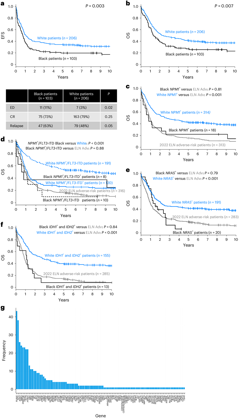 (a-b) 黑人和白人患者的治疗反应和生存率比较。(c) 黑人和白人NPM1突变患者的OS与2022年ELN不良风险患者的OS比较。(d) 与2022年ELN不良风险患者的OS相比,NPM1突变黑人和白人患者的OS以及存在或不存在FLT3-ITD的OS。(e) 黑人和白人NRAS突变患者的OS与2022年ELN不良风险患者的OS比较。(f) 黑人和白人IDH1和IDH2突变患者的OS与2022年ELN不良风险患者的OS比较。(g) 基因突变频率分析。