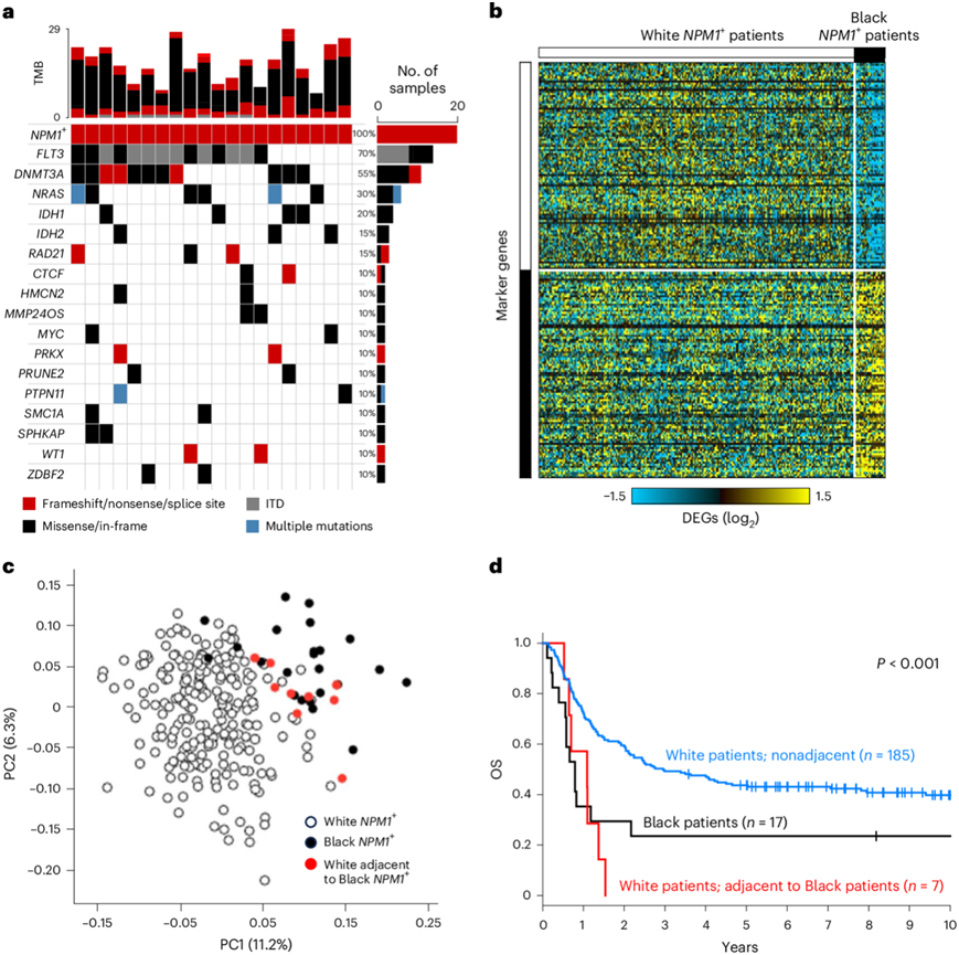 (a) 具有NPM1突变的黑人患者的突变肿瘤印记。(b) 祖先相关基因表达差异的标记热图。(c) 可视化NPM1基因表达变异的前两个主要成分。(d) OS的比较分析。