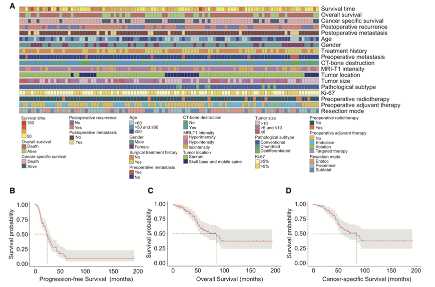 (A) 构建的脊索瘤队列的临床数据热图。(B-D) 脊索瘤患者的 PFS、OS和 CSS的 Kaplan-Meier 曲线。
