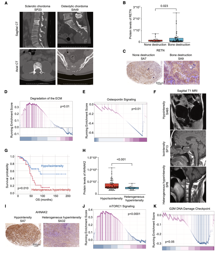 (A) 硬化性和溶骨性脊索瘤的代表性 CT 。(B-C) 脊索瘤中 RETN 的蛋白质水平和代表性免疫组织化学(IHC)图像。(D-E) GSEA 富集分析揭示了 ECM 降解和骨桥蛋白信号传导的差异。 (F) 脊索瘤的 MRI 代表性 T1 加权图像(低信号、等信号、不均匀高信号)。(G) 低/中等信号和异质性高信号之间 OS 的 Kaplan-Meier 曲线。(H-I) AHNAK2 的蛋白质水平和代表性 IHC 图像。(J-K) GSEA 富集分析揭示了 mTORC1 信号传导和 G2/M DNA 损伤检查点的差异。