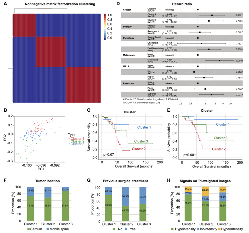 (A) 使用蛋白质组学数据进行 NMF 聚类来识别分子亚型。 (B) PCA 图显示了已识别的三个聚类中脊索瘤样本的 t-SNE 分布。(C) 所有脊索瘤患者中已确定的三个聚类的 OS 的 Kaplan-Meier 曲线。(D) 队列中脊索瘤患者 OS 的多元 Cox 回归分析森林图。(E) 未发生远处转移且未进行次全切除的患者中,确定的三个聚类的 OS 的 Kaplan-Meier 曲线。