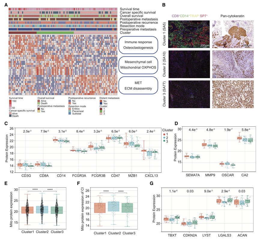 (A) 基于已识别的三个聚类中的 DEP 功能富集分析的 NMF 聚类。 (B) 脊索瘤亚型中 CD8、CD14、SP7、TRAP 的代表性多色 IF。(C-D) 已鉴定的三个聚类中关键免疫微环境标志物和骨微环境标志物的蛋白质表达。(E-F) 脊索瘤亚型中的 Mito 蛋白表达和 CI 的 Mito 蛋白表达。(G) 已鉴定的三个聚类中先前报道的脊索瘤突变基因的蛋白质表达。