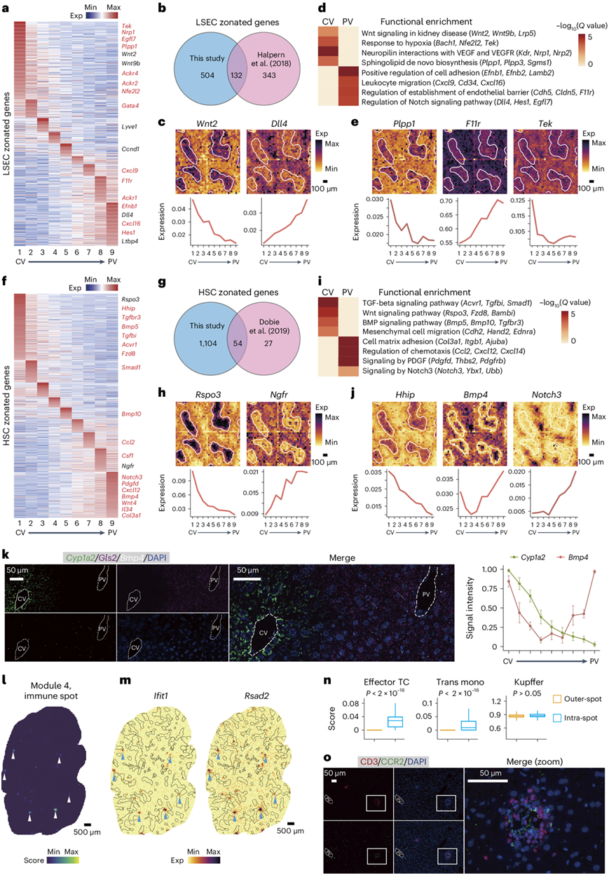 (a,f) 跨生物重复的所有稳态切片中每个分区层的636 LSEC 和1158 HSC 分区基因的平均表达。 (b,g) 维恩图比较本研究中鉴定的 LSEC 分区基因与配对细胞测序鉴定的基因,以及本研究鉴定的 HSC 分区基因与 HSC scRNA-seq 研究鉴定的基因。(c,e,g,j) 上:已知的和新发现的LSEC分区基因,以及已知的和新发现的HSC分区基因(D0-DY1)的表达水平的空间可视化。下:所有稳态部分中每个分区层的平均表达水平。(d,i) 中央周围和门静脉周围 LSEC或 HSC 分区基因的功能富集结果。(k) 左:稳态肝脏中Cyp1a2、Gls2和Bmp4表达的代表性 smFISH 图像。右:平均信号强度。 (l) 免疫点(模块4)基因的模块得分的空间可视化(D0-DY1部分)。(m) 免疫点基因的空间可视化(D0-DY1 部分)。(n) 指定细胞类型在免疫点内部或外部的分布。(o) CD3(T 细胞)和 CCR2(单核细胞)免疫荧光染色的代表性图像。