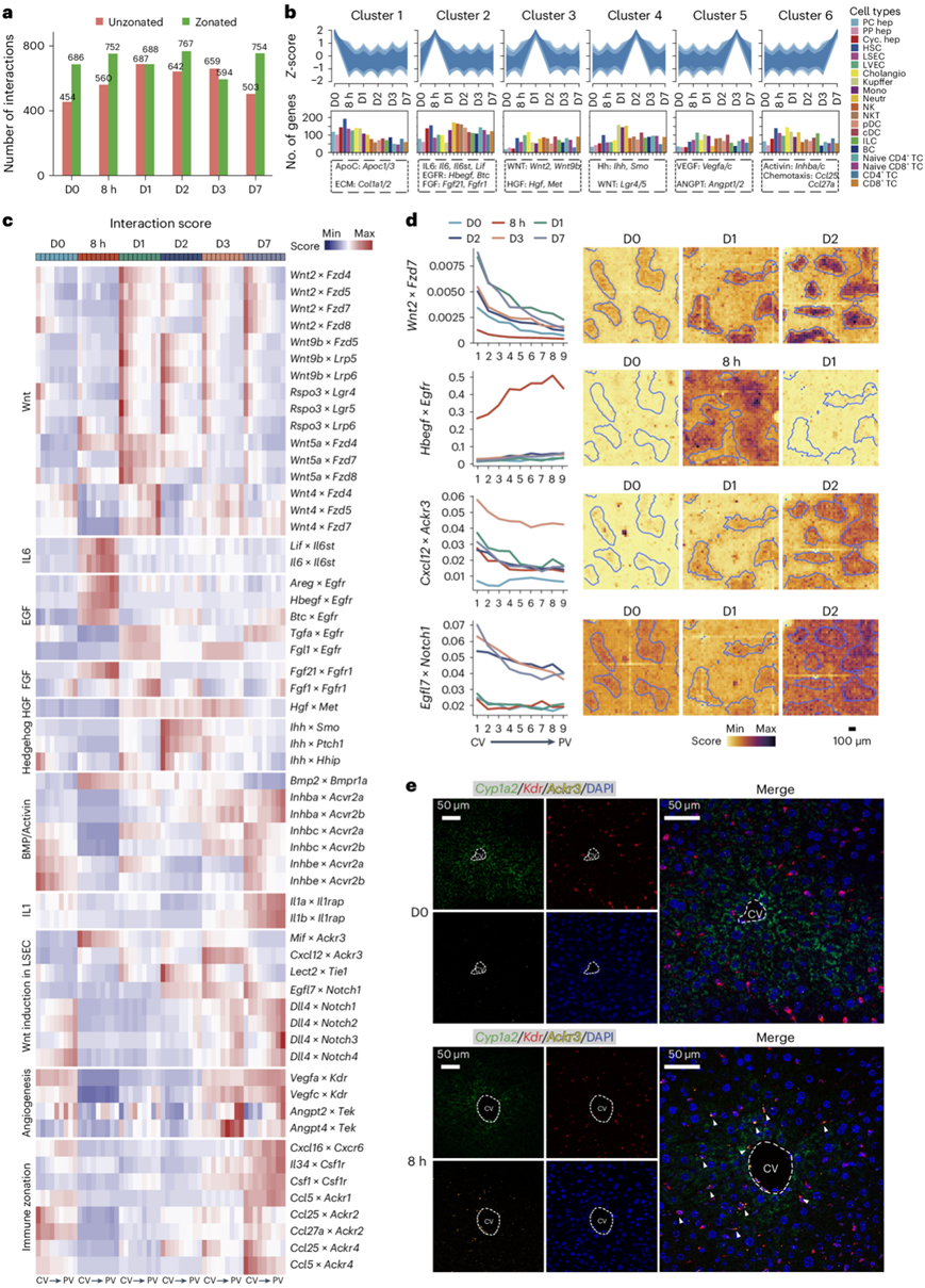 (a) 条形图显示在所有再生部分中识别的相互作用的数量。(b) 肝再生细胞基质的模糊聚类分析以及每个细胞表达的肝再生细胞基质中相应基因组的配体或受体的数量。(c) 所有再生部分中每个分区层的指定配体-受体相互作用的平均相互作用得分。(d) 左,所有再生部分中每个分区层的平均相互作用得分。右:指定时间点相应交互的估算交互得分的空间可视化。(e) 来自稳态肝脏(上)或 PHx 后 8 小时(下)切片中Cyp1a2、Kdr(LSEC 标记)和Ackr3的代表性 smFISH 图像。