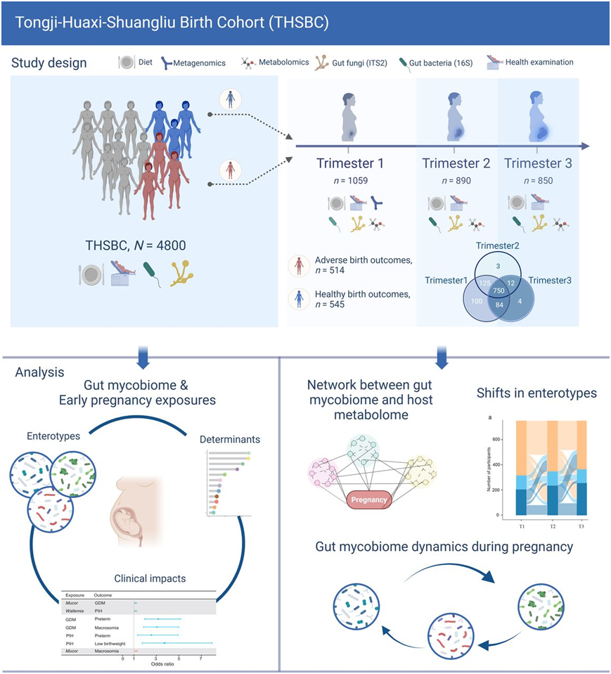 在正常怀孕期间,母体会发生剧烈的生理变化,包括免疫、激素和代谢变化。肠道菌群可视为一个虚拟器官,而怀孕状态与肠道菌群的显著改变有关。有假设认为宿主可以操纵肠道菌群来促进怀孕期间的代谢变化,最终支持胎儿的生长发育。值得注意的是,胃肠道中不仅有细菌,还有真菌。然而,与对肠道细菌的广泛研究相比,对真菌群落的研究仍然很少。作为肠道菌群的主要组成部分,肠道真菌在肠道生态中发挥着至关重要的作用,而肠道生态对宿主的健康至关重要。然而,关于妊娠期间肠道菌群的重塑,肠道菌群的动态及其与肠道微生物功能、宿主代谢、妊娠并发症和不良分娩结果的相互作用尚未得到很好的研究。