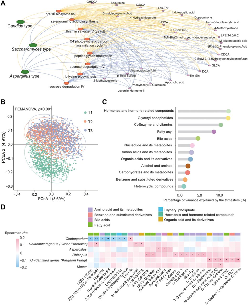 (a) 肠道真菌肠型、微生物功能和宿主代谢组之间的网络分析。 (b) 比较在妊娠不同阶段采集的血清样本的整体代谢模式。(c) 基于堪培拉差异性,不同类别代谢物在妊娠期间随时间发生的代谢改变程度。(d) 从妊娠前三个月到妊娠晚期,各个核心真菌属和各个血清代谢物之间的共变关系热图。对核心肠道真菌的变化和代谢物的变化进行了 Spearman 相关性分析。