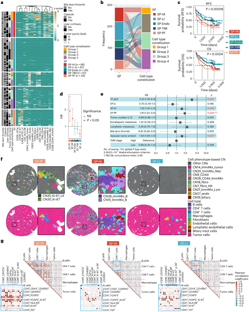 (a) 热图显示基于指示细胞表型的 CN 的z分数百分比的聚类。(b) 桑基图显示 SP 与细胞类型构成之间的关系。(c) SP 的 Kaplan-Meier 生存曲线。(d) SP 的 HR。(e) RFS 的多变量分析。(f) 不同 SP 中所示基于细胞表型的 CN和细胞类型的代表性 Voronoi 图。(g) 所有具有不同 SP 的样本中细胞类型和表型之间的Pearson相关性。