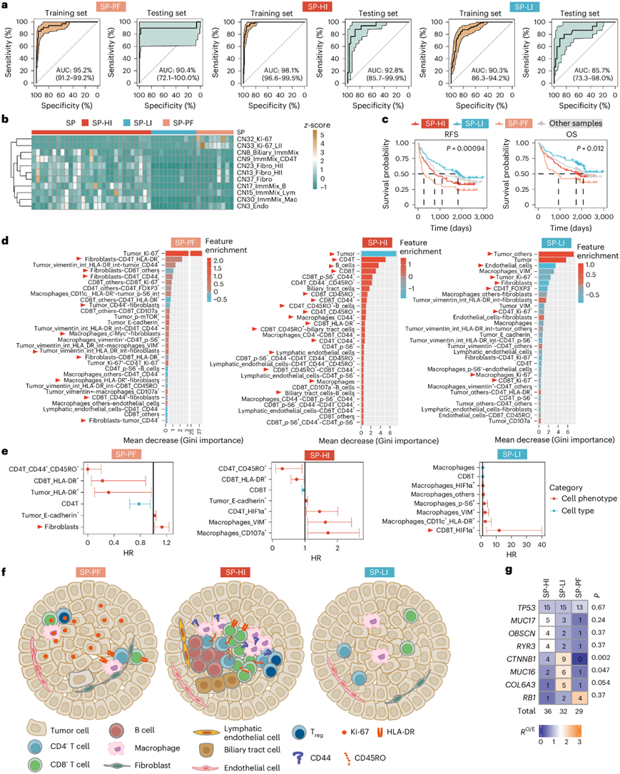 (a) 训练和测试集中 SP-PF、SP-HI 和 SP-LI 分类器的准确度。 (b) 热图显示验证队列中指示细胞表型的 CN 的z分数百分比。(c) Kaplan-Meier 生存曲线。(d) 条形图显示指示分类器中前 30 个特征的基尼重要性(Gini Importance)。(e) 发现队列中指示特征的 HR。(f) SP-PF、SP-HI 和 SP-LI 的代表性空间图形。(g) 根据三个 SP 的 RO/E 分数显示基因组突变丰度的热图。