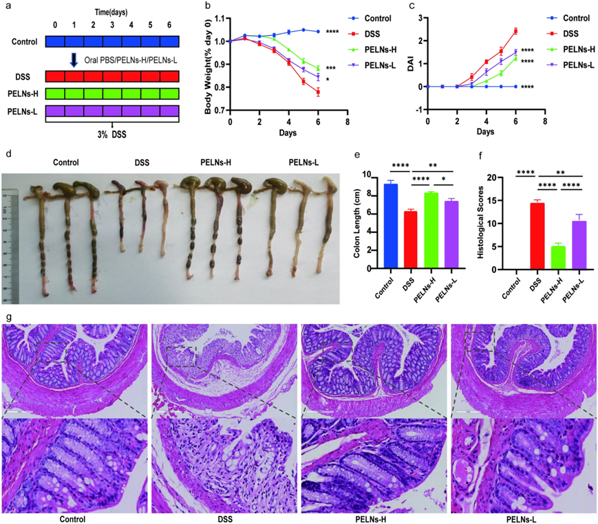 a,DSS诱导的结肠炎和PELN给药方案; b,体重随时间的变化,标准化为零日体重的百分比; c疾病活动指数(DAI); d、e,结肠长度; f,组织学评分; g,H&E染色结肠切片