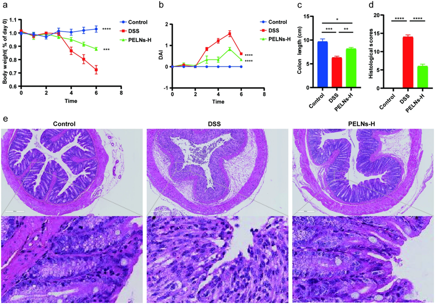 1. 口服PELNs可有效抑制促炎细胞因子TNF-α、IL-6、IL-12和IL-1β的表达,增加抗炎细胞因子(IL-10)水平,减轻DSS诱导的结肠炎和IL-10−/− 小鼠的急性结肠炎。
