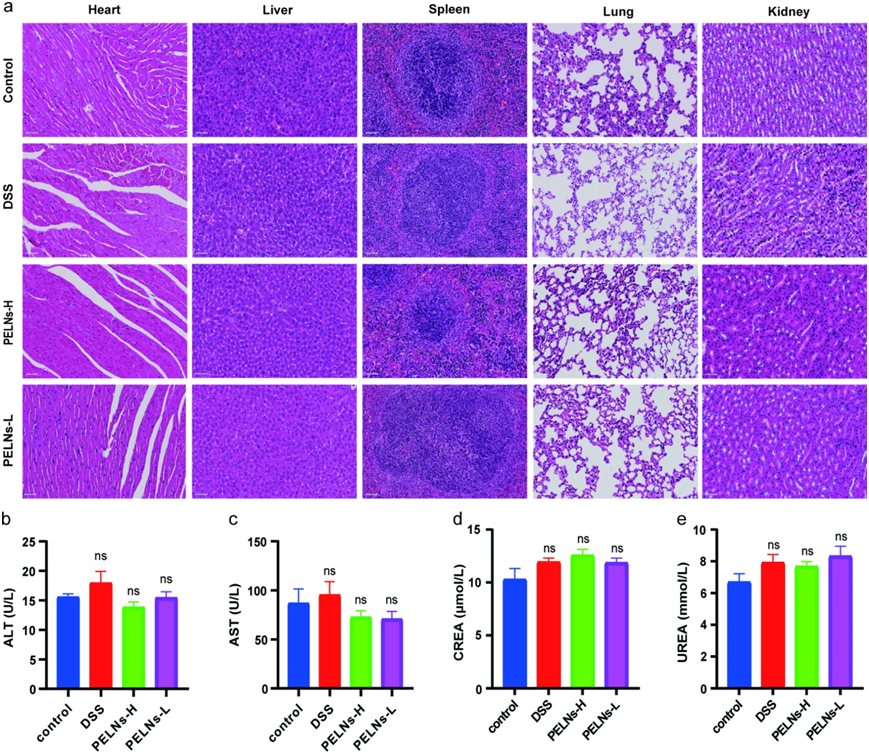 a:对照组、DSS、PELNs-L和PELNs-H组小鼠重要器官(心、肝、脾、肺、肾)的H&E染色图; b、c:小鼠肝功能检测; d、e:小鼠肾功能检测