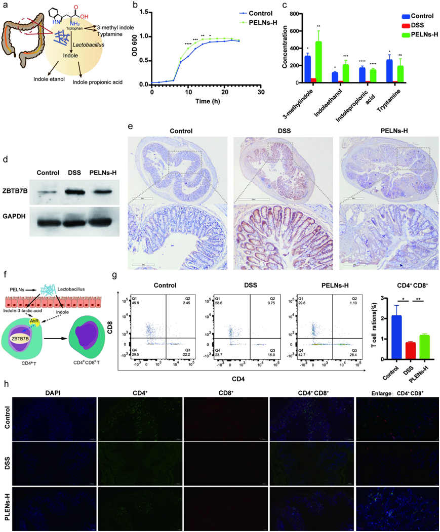 a:模式图 :Lactobacillus reuteri 将色氨酸(L-Trp)转化为吲哚衍生物; b:PELNs处理显著增加吲哚衍生物的水平; d、e:通过WB和IHC检测,PELNs处理可显著降低Zbtb7b蛋白水平; f:示意图表示 Lactobacillus reuteri 可以激活常规CD4+ T细胞中的芳基烃受体,导致Zbtb7b蛋白表达下调和常规CD4+ T细胞分化 CD4+CD8+ T细胞; g:流式细胞术检测结肠样本中的CD4+CD8+ T细胞; h:免疫荧光显示结肠样本中的CD4+CD8+ T细胞
